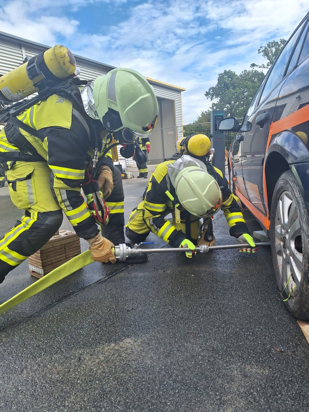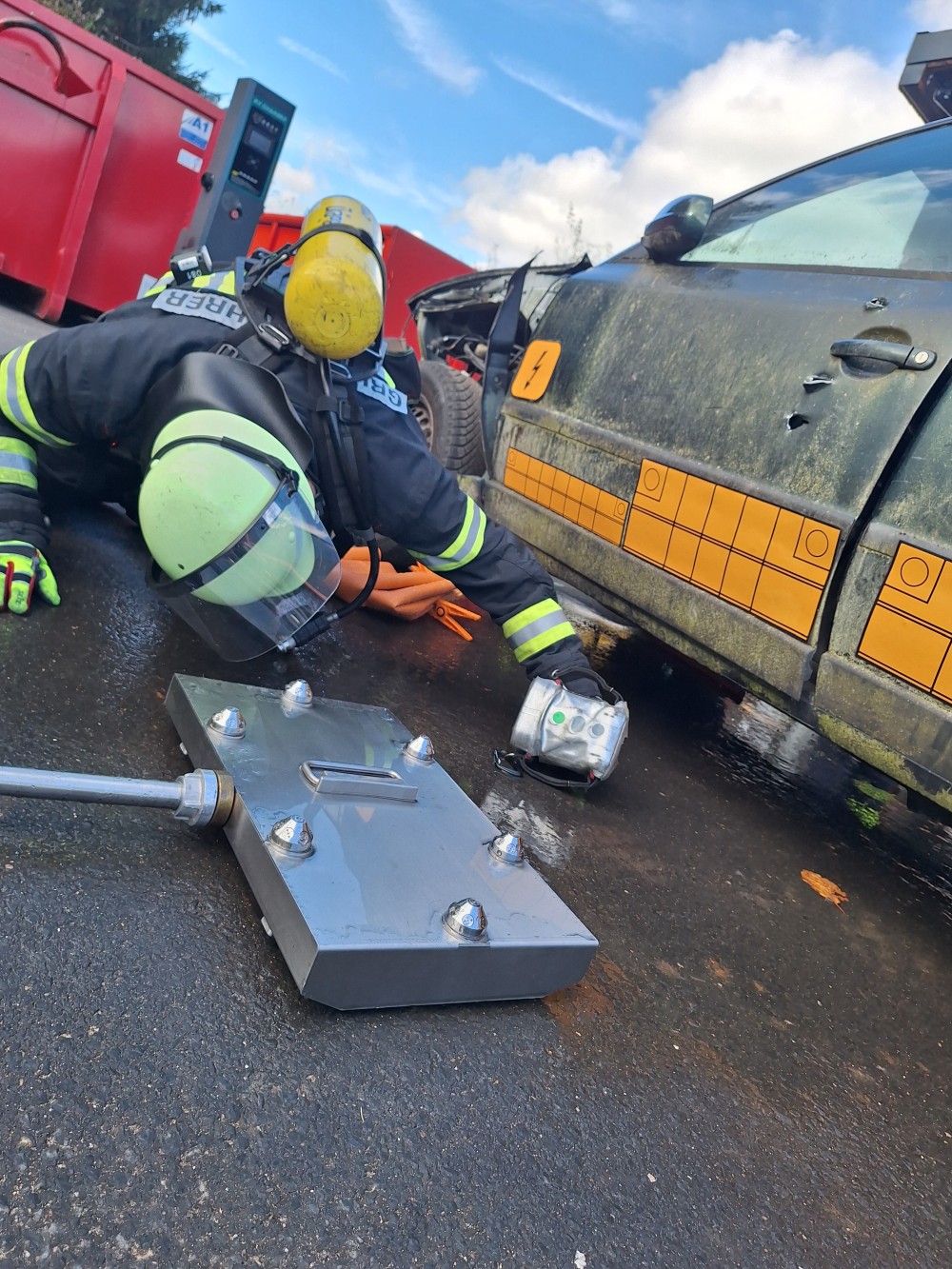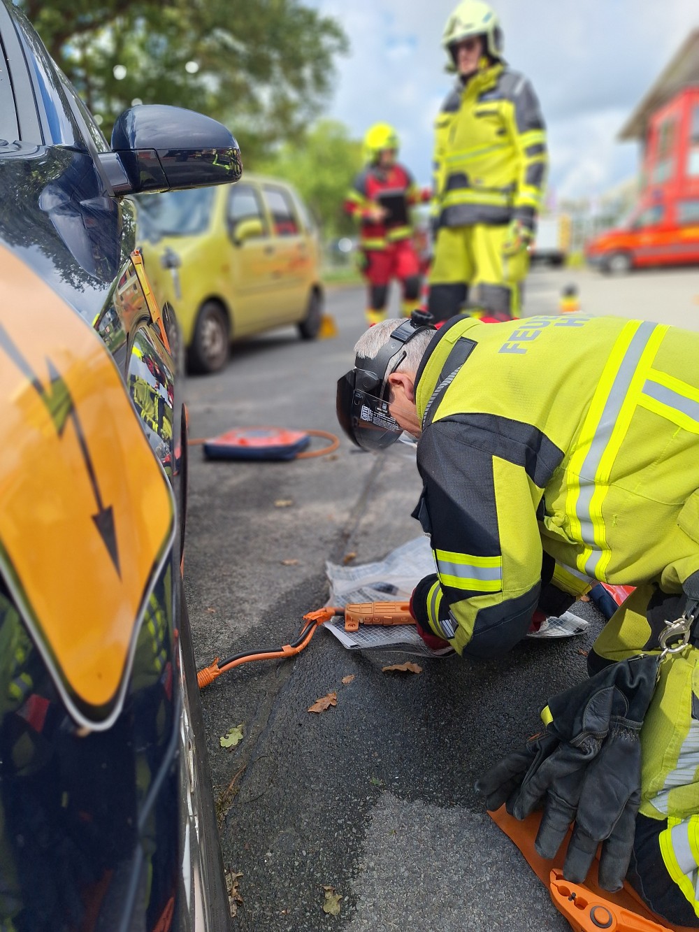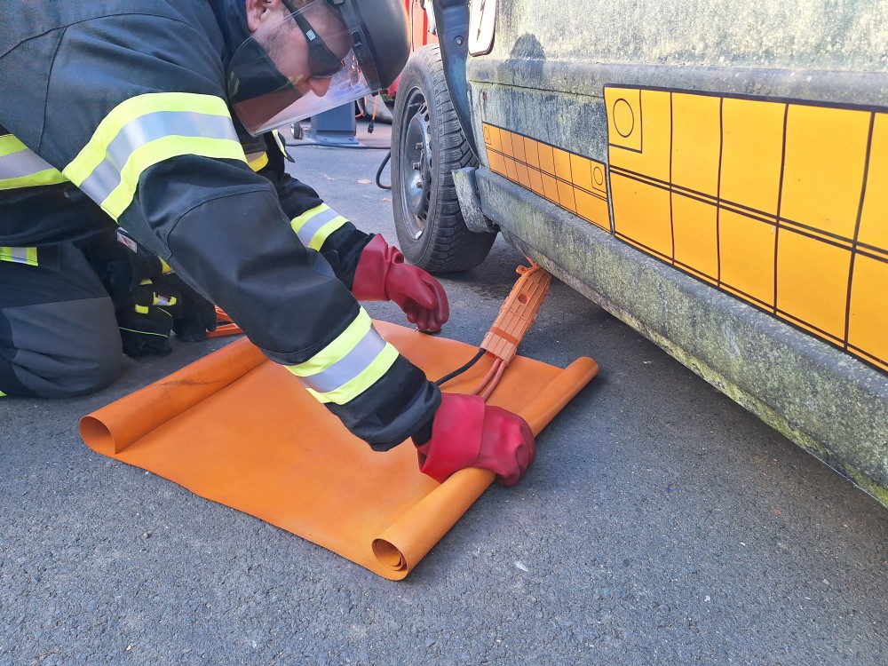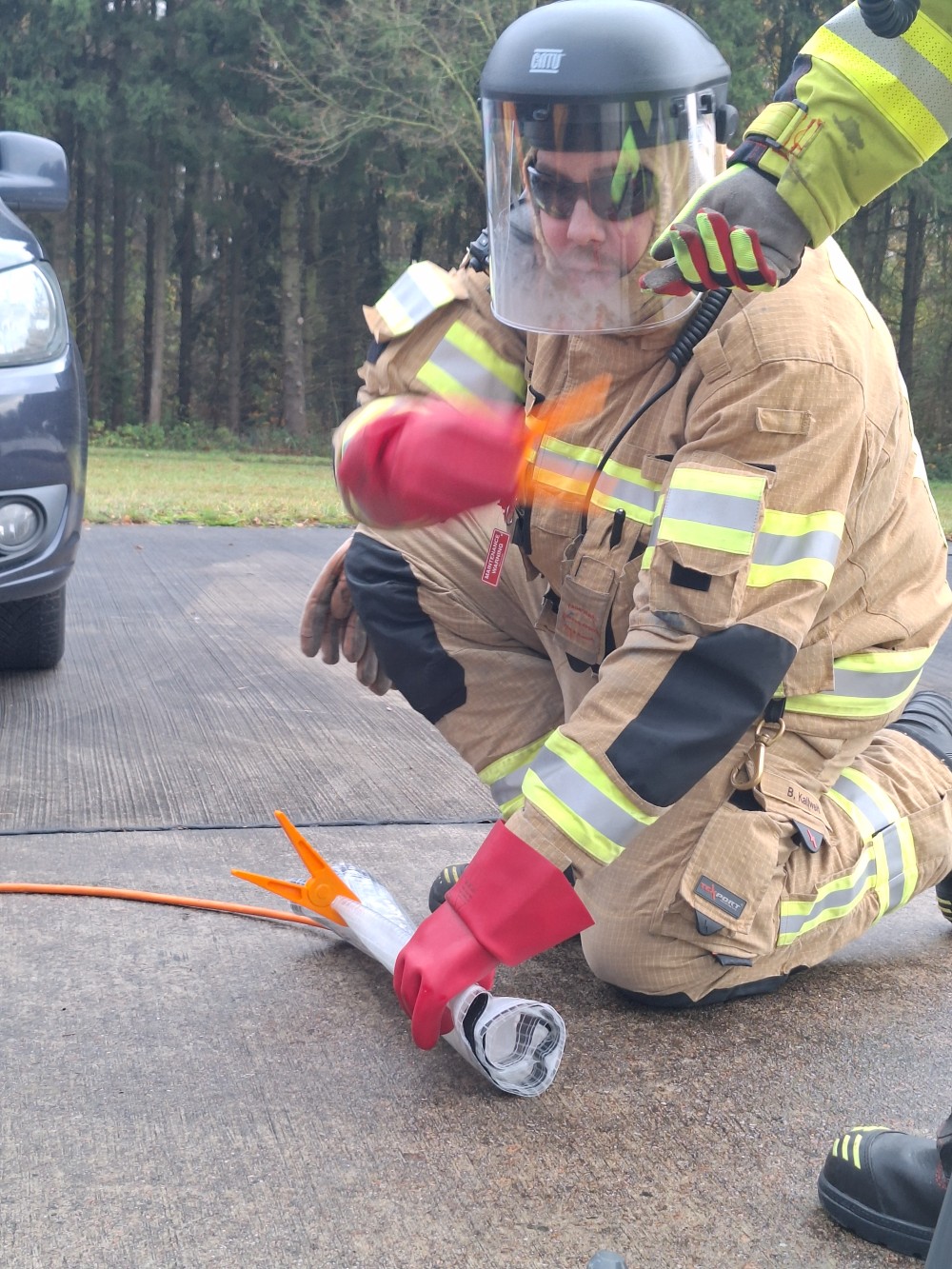 Im praktischen Teil werden unter Anleitung und Unterstützung verschiedene Einsatzübungen abgehalten, das erlernte in die Praxis umgesetzt. Von der Einsatzstellenerkundung, sicherung der Hochvolt-Anlage, umsetzung der Einsatztaktik, anwendung der angepassten PSA, einbindung vom Rüstsatz für Elektrofahrzeuge bis hin zum thermischen Durchgehen der Hochvolt-Batterie.