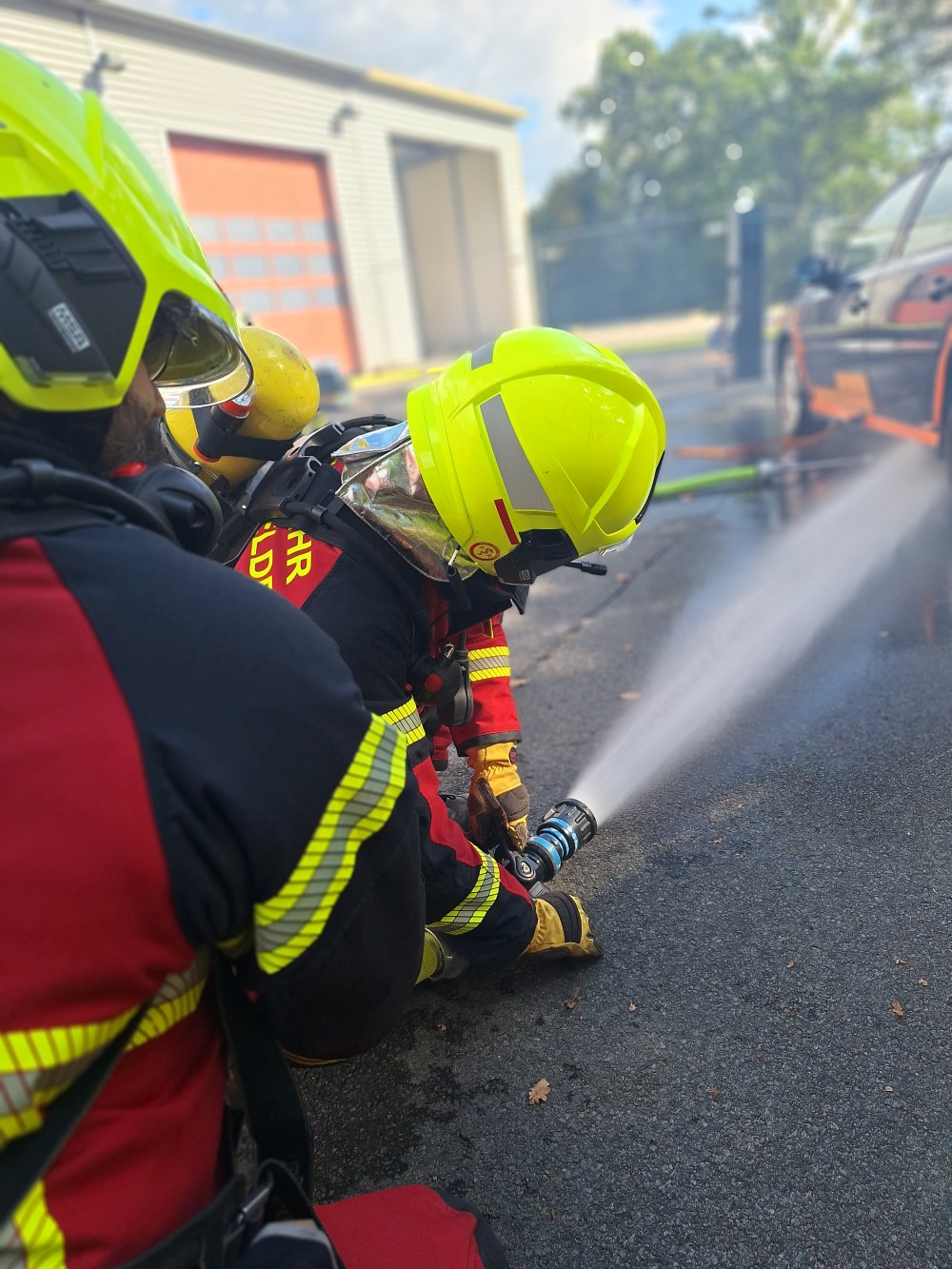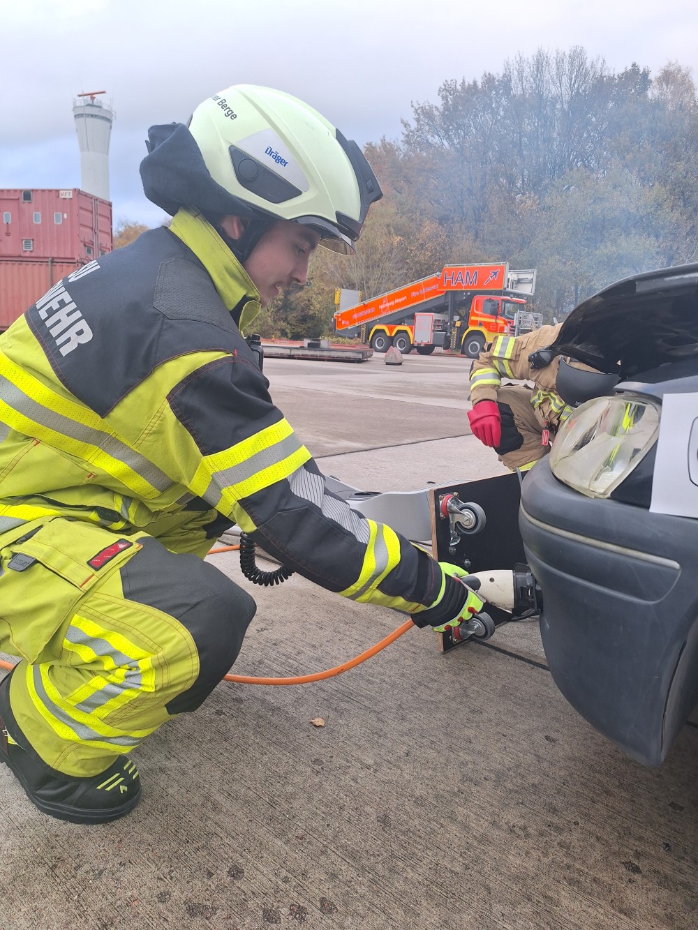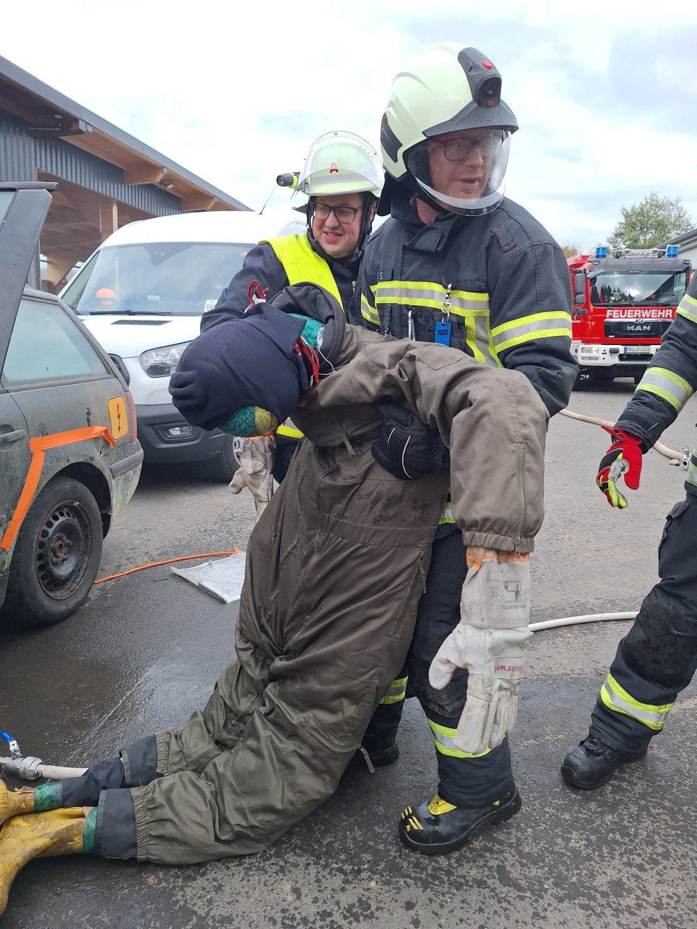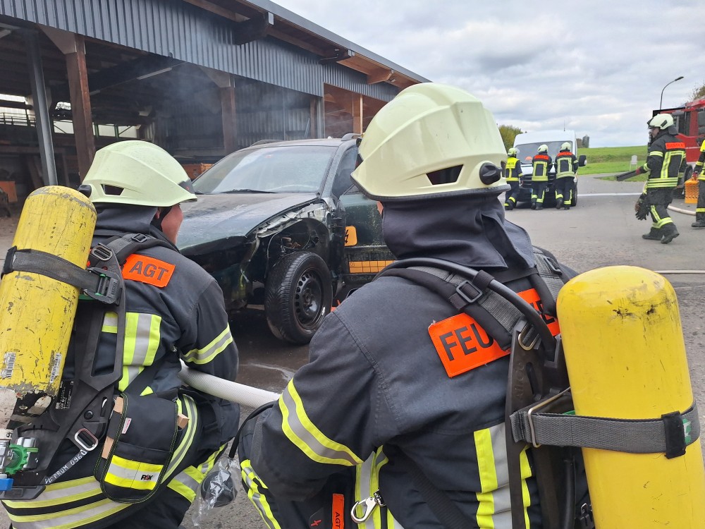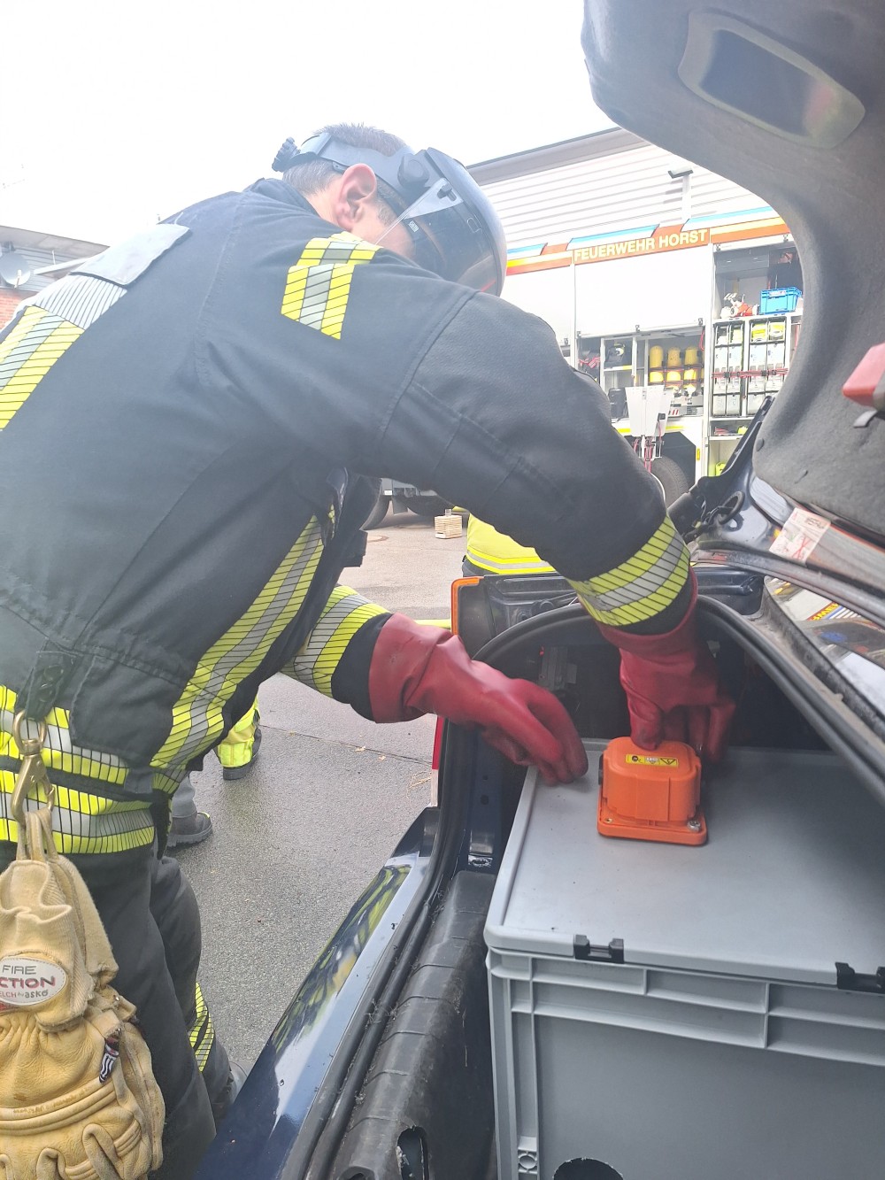 Im praktischen Teil werden unter Anleitung und Unterstützung verschiedene Einsatzübungen abgehalten, das erlernte in die Praxis umgesetzt. Von der Einsatzstellenerkundung, sicherung der Hochvolt-Anlage, umsetzung der Einsatztaktik, anwendung der angepassten PSA, einbindung vom Rüstsatz für Elektrofahrzeuge bis hin zum thermischen Durchgehen der Hochvolt-Batterie.